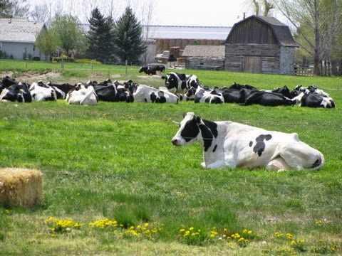 Cows are ruminant animals because they chew their cud. They have one stomach with four compartments. By chewing, regurgitating, and chewing what they eat over and over again, the animal is able to extract every last bit of nutrition out of its food. Most often they are found sitting and resting during this lengthy process.