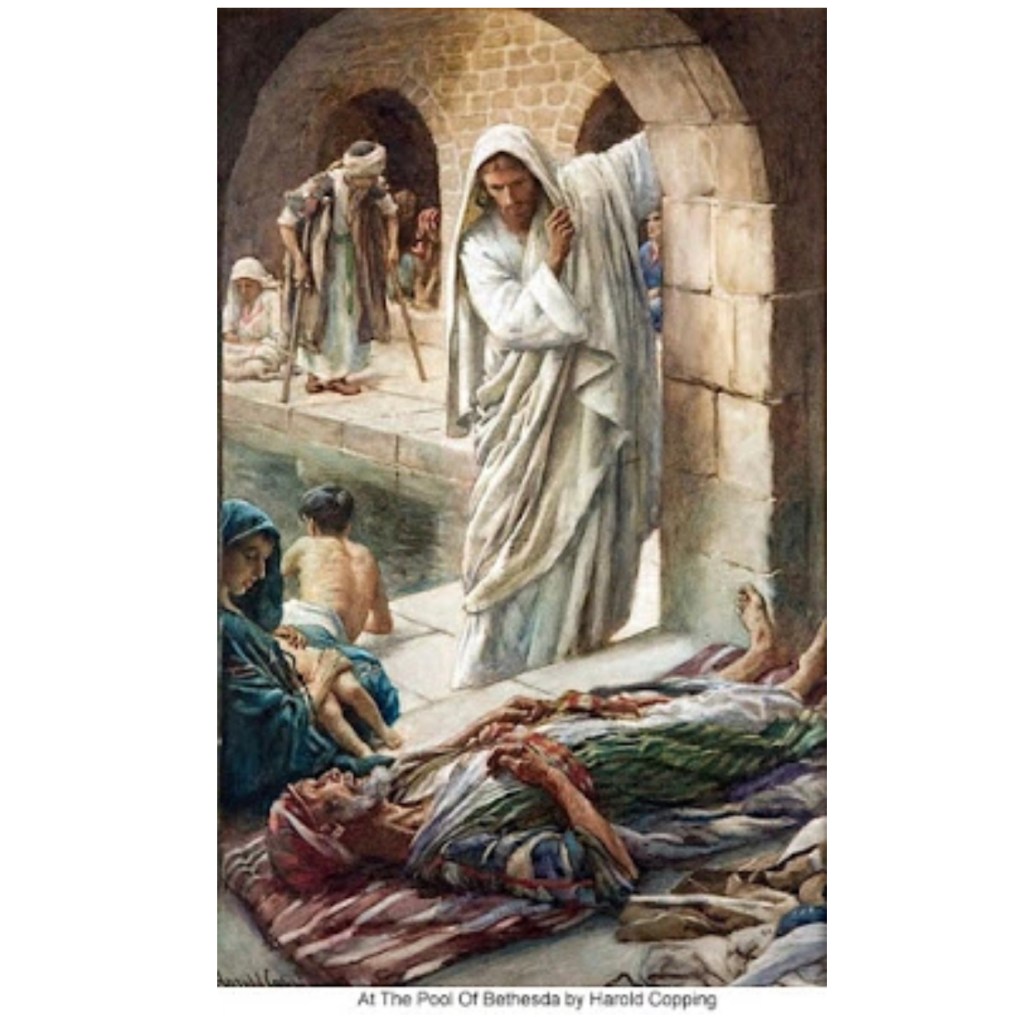 “Now there is in Jerusalem by the Sheep Gate a pool, which is called in Hebrew, Bethesda, having five porches. In these lay a great multitude of sick people, blind, lame, paralyzed, waiting for the moving of the water. For an angel went down at a certain time into the pool and stirred up the water; then whoever stepped in first, after the stirring of the water, was made well of whatever disease he had.
